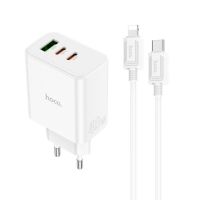 Сетевое зарядное устройство Hoco C126A, 1 USB, 2 Type-C, PowerDelivery (40 Вт), белое, с кабелем Type-C на Lightning Студийное фото