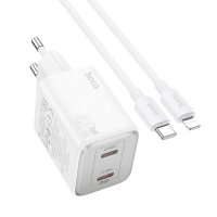 Сетевое зарядное устройство Hoco N42 2 Type-C Power Delivery (45 Вт), білий + кабель Type-C на Lightning Студийное фото