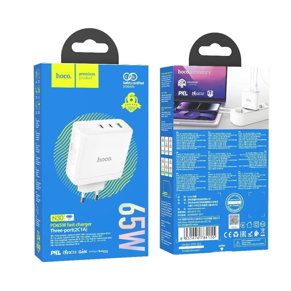 Сетевое зарядное устройство Hoco N30, 1 USB, 2 USB Type-C, Quick Charge, Power Delivery, 65 Вт, белое