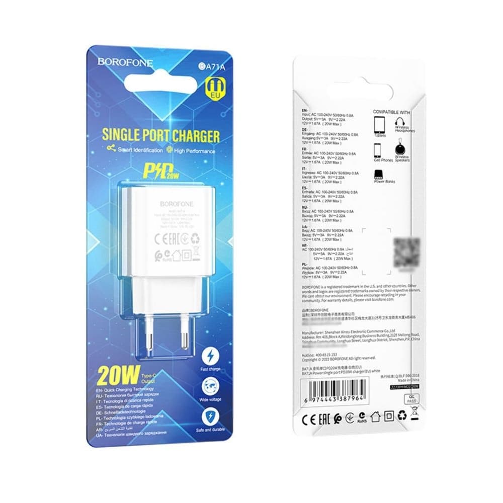 Сетевое зарядное устройство Borofone BA71A, Type-C, Power Delivery (20 Вт), белое Студийное фото
