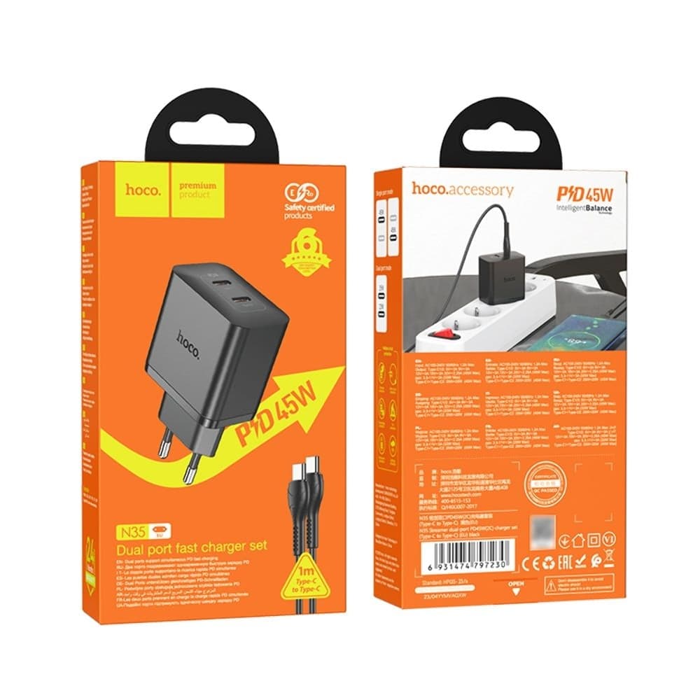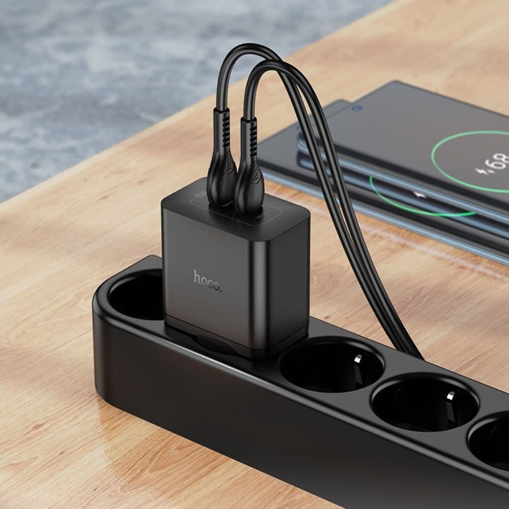 Сетевое зарядное устройство Hoco N35, 2 USB Type-C, Power Delivery (45 Вт), черное, с кабелем Type-C на Type-C Студийное фото