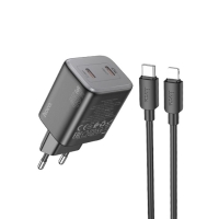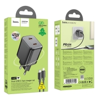 Сетевое зарядное устройство Hoco N42 2 Type-C Power Delivery (45 Вт), чорний + кабель Type-C на Lightning Студийное фото